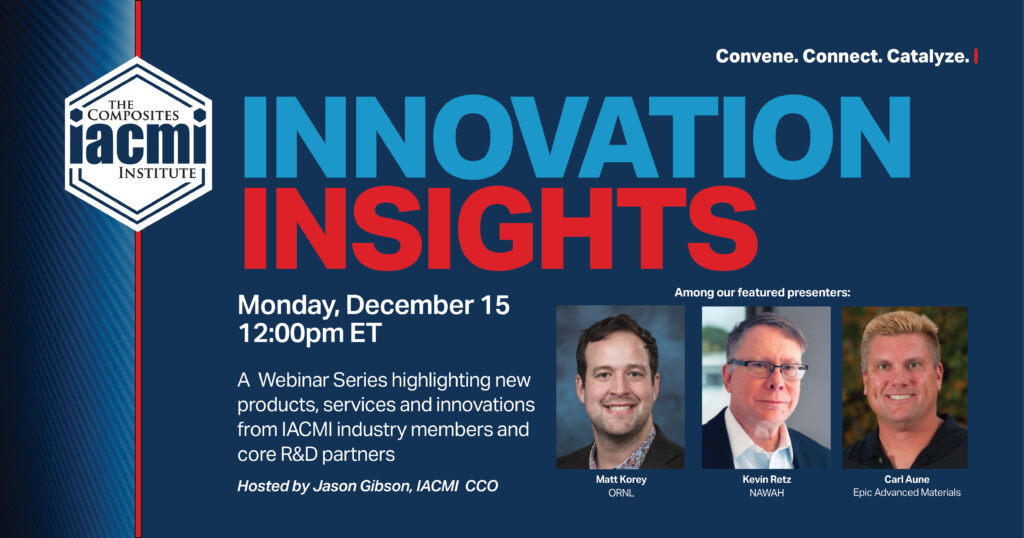Our monthly webinar series “Innovation Insights” continues Monday, December 15 at 12:00 pm ET. IACMI CCO Jason Gibson moderates discussions with IACMI members featuring their latest news about products, services, technology, and innovations.