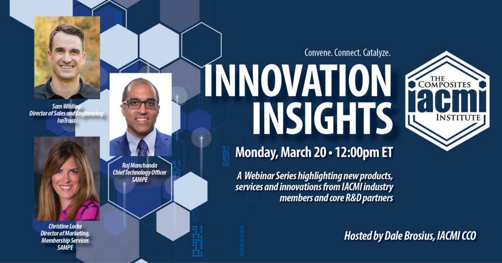 Watch Innovation Insights from March 20 featuring Isotruss and SAMPE. Our monthly webinar series “Innovation Insights” continued, as IACMI Interim CEO, Dale Brosius, will moderate discussions on recent technology advancements that industry may not be fully aware of. On Monday March 20 at 12PM ET, we hosted a one-hour series of presentations from IACMI members and partners, where they will provide background on new technology, products, and the key advantages provided, as well as application examples.