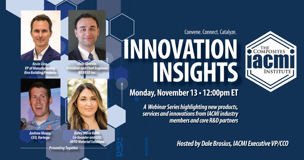 Our monthly webinar series “Innovation Insights” continued Monday, November 13, as IACMI EVP/CCO Dale Brosius, moderated discussions on recent technology advancements. IACMI members and partners presented background on new technology, products, and the key advantages provided, as well as application examples.