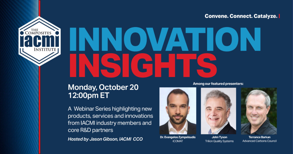 Our monthly webinar series “Innovation Insights” continues Monday, October 20, at 12:00 pm ET. IACMI CCO Jason Gibson moderates discussions with IACMI members featuring their latest news about products, services, technology, and innovations.